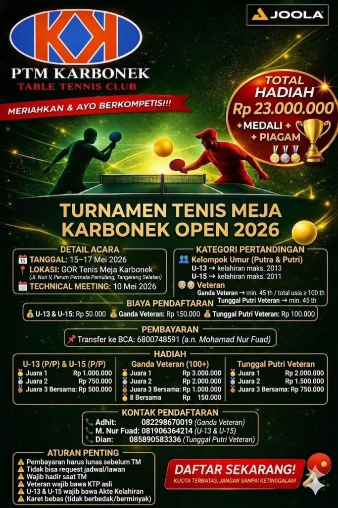 TENISMEJA.NET – Tangerang Selatan – Kabar gembira bagi pecinta olahraga tenis meja. Klub tenis meja PTM Karbonek Table Tennis Club akan menggelar ajang bergengsi Turnamen Tenis Meja Karbonek Open 2026 pada 15–17 Mei 2026 bertempat di GOR Tenis Meja Karbonek, Jl. Nuri V, Perum Permata Pamulang, Tangerang Selatan. Turnamen ini hadir sebagai wadah kompetisi sekaligus…