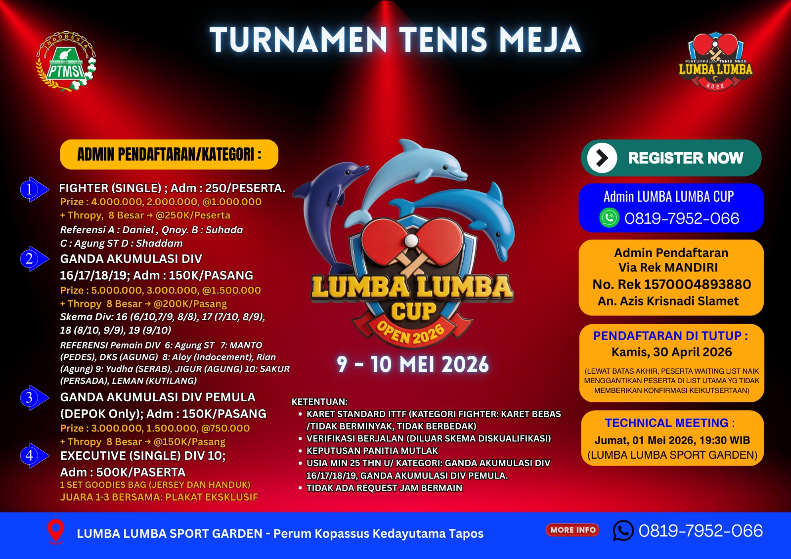 Dengan konsep kompetisi yang terstruktur dan hadiah yang menggiurkan, Turnamen Lumba Lumba Cup Open 2026 diharapkan dapat menjadi wadah pembinaan sekaligus ajang unjuk kemampuan bagi para pecinta tenis meja di Indonesia.