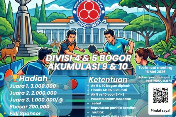 Turnamen Tenis Meja Ganda Se-Bogor Raya dan Undangan | 23-24 Mei 2026 Untuk Divisi 4 dan 5 Bogor Akumulasi 9 & 10 Biaya Admin: Rp 150.000,-/Pasang Technical Meeting 16 Mei 2026 Hadiah (FULL SPONSOR) : Juara 1: Rp 3.000.000,- Juara 2: Rp 2.000.000,- Juara 3 Bersama: @ Rp 1.000.000,- 8 Besar: @ Rp 200.000,- Ketentuan:…